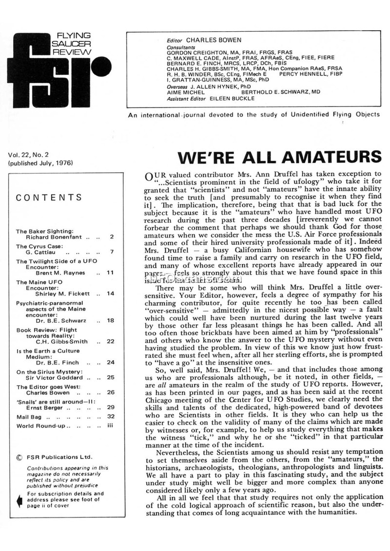 This document is the front cover and contents page of the July 1976 issue of Flying Saucer Review (Vol. 22, No. 2). The editorial, titled 'We're All Amateurs,' addresses a tension between professional scientists and amateur researchers in the field of ufology. The editor, Charles Bowen, responds to comments made by contributor Mrs. Ann Druffel, who expressed frustration regarding the perceived arrogance of scientists who dismiss amateur contributions. Bowen argues that while the publication values the input of professional scientists—citing the recent Chicago meeting of the Center for UFO Studies as an example of where such collaboration is useful—he emphasizes that the study of UAP requires both the application of scientific logic and an understanding of human nature. The document lists the editorial staff and consultants, including notable figures such as J. Allen Hynek and Aime Michel. The contents page outlines various articles, including 'The Baker Sighting,' 'The Cyrus Case,' and 'The Twilight Side of a UFO Encounter,' among others.