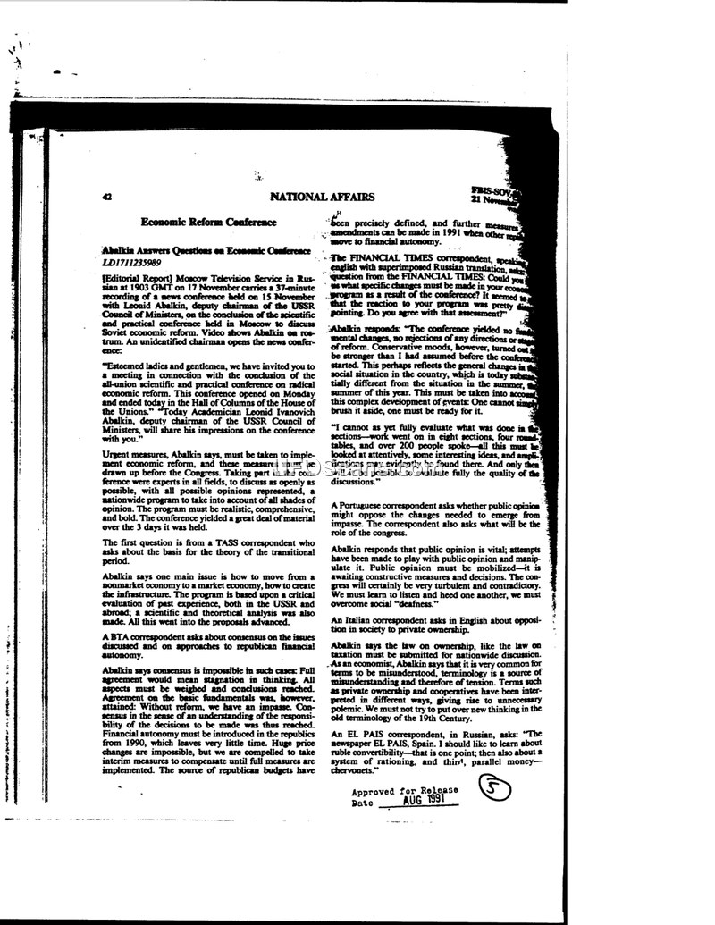 This document consists of transcripts from Moscow Television Service reports covering two primary events: an economic conference featuring Leonid Abalkin, Deputy Chairman of the USSR Council of Ministers, and a session of the Supreme Soviet. In the first section, Abalkin addresses questions regarding the transition to a market economy, the necessity of republican financial autonomy, and the challenges of managing public opinion during a period of significant economic instability. He emphasizes the need for a realistic and comprehensive approach to reform, noting that consensus is difficult to achieve given the diverse political landscape. Abalkin also touches upon international relations, referencing the economic paths taken by Poland and Hungary. The second section provides a detailed log of a Supreme Soviet session held on 20 November. The proceedings involve various deputies raising procedural and legislative concerns, including the status of the Press Law, republican autonomy, and the management of public demonstrations. The session highlights the internal political tensions within the Soviet government as it attempts to navigate legislative reform amidst economic and social pressures.