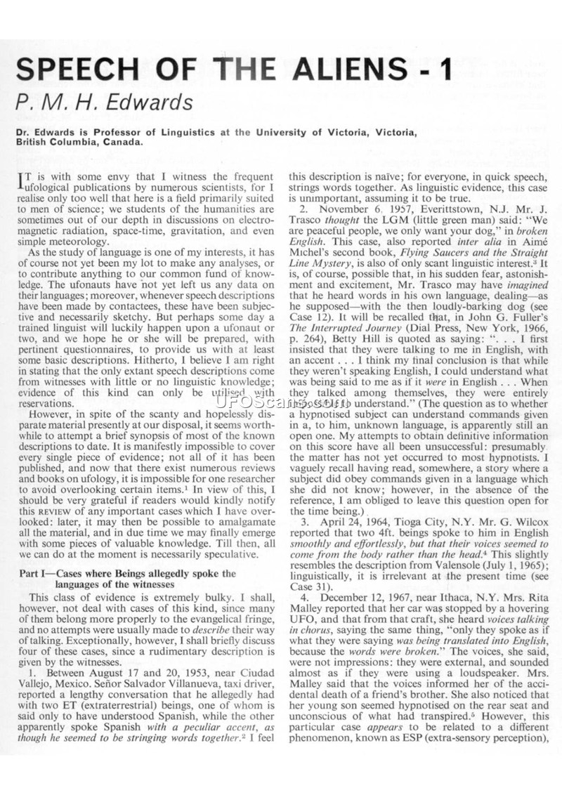 This article, written by P. M. H. Edwards, a Professor of Linguistics at the University of Victoria, examines the linguistic aspects of reported extraterrestrial encounters. Edwards expresses skepticism regarding the value of witness accounts in ufological publications, noting that such reports are often subjective and provided by individuals without scientific training. The document is divided into three parts. Part I discusses cases where witnesses claimed the entities spoke human languages, often with accents or in broken speech. Edwards highlights the difficulty of verifying these claims, noting that even if a witness reports understanding an alien, the possibility of hypnotic suggestion or misinterpretation remains. Specific cases cited include reports from 1953, 1957, 1964, and 1967. Part II details reports of 'ET voices,' including a 1958 account from a Sheffield newspaper regarding a musician who recorded alien sounds, and various sightings in France, Brazil, and the United States between 1947 and 1968. These reports describe sounds ranging from 'unintelligible' to 'nasal' or 'gurgling.' Part III focuses on cases where witnesses reported that the alien language was entirely unintelligible, citing incidents from 1909 to 1967 in locations such as Wales, Spain, Brazil, France, and Canada. The document concludes with a separate, unrelated excerpt from E. G. Schary's book 'In Search of the Mahatmas of Tibet,' describing a 1917 sighting of a luminous disc in Tibet, which locals referred to as 'Pearls of the sky.' The article serves as a critical review of the anecdotal evidence currently available to researchers in the field of ufology.