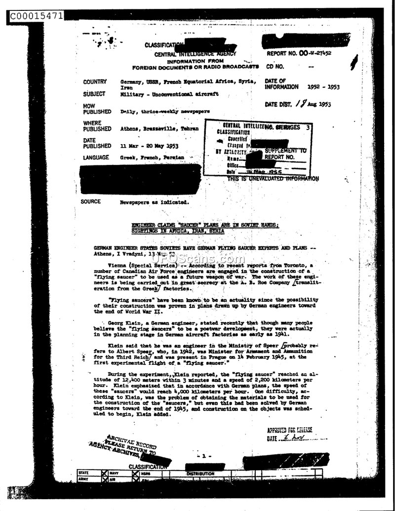 This CIA intelligence report documents claims that Nazi Germany developed flying saucer technology later acquired by the Soviet Union. It also compiles contemporary 1952-1953 eyewitness reports of unidentified aerial phenomena in Africa, Syria, and Iran.