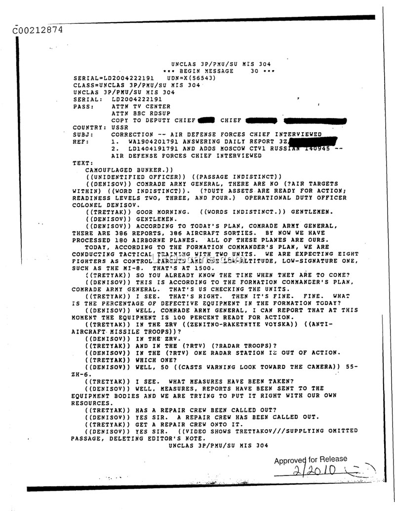 This transcript details a discussion on Soviet Air Defense readiness and includes a dismissive official stance on UFO sightings, citing a specific radar-tracked event near Moscow that was identified as non-UFO.