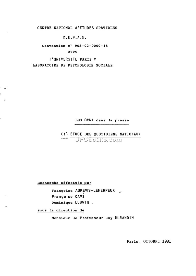 This research report, dated October 1981, was produced by the Laboratory of Social Psychology at the University of Paris V under a convention with the Centre National d'Etudes Spatiales (CNES) and its UFO research group, G.E.P.A.N. The primary objective of the study was to analyze the representation of Unidentified Aerial Phenomena (UFOs) in the French national daily press between January 1, 1974, and December 31, 1980. The researchers aimed to understand how the media shaped public perception of UFOs and to compare media accounts with official Gendarmerie reports. The study initially intended to cover national dailies, regional dailies, and ufological journals, but due to material and temporal constraints, it focused on seven national daily newspapers: L'Aurore, La Croix, Le Figaro, France-Soir, L'Humanité, Le Monde, and Le Parisien Libéré. The methodology involved a two-level content analysis. The first level categorized articles by their general theme and content type, while the second level focused specifically on articles reporting UFO observations or identifications. The researchers developed specific coding grids to quantify and qualify the information provided to readers, including the date of publication, the 'trigger' for the article (e.g., an observation, a book release, a conference), the form of the article (e.g., report, interview, reader letter), and the prominence given to the article (e.g., page placement, presence of illustrations). The report details the findings for each newspaper, noting significant variations in how they covered the subject. For instance, some newspapers like Le Monde and La Croix were found to accord a more scientific status to the topic, while others like Le Parisien Libéré or France-Soir showed different editorial priorities. The study also attempted to compare these media reports with Gendarmerie records, finding that while some observations were documented in both, there were frequent discrepancies in the classification of the phenomena. The report concludes that there is no uniform 'press image' of UFOs; rather, coverage is highly dependent on the editorial style and priorities of each publication. The researchers emphasize the need for caution when interpreting these results due to the non-exhaustive nature of the archives for some newspapers and the inherent difficulties in comparing media narratives with official administrative reports. The document includes extensive tables and appendices detailing the methodology, coding grids, and statistical data gathered during the research.