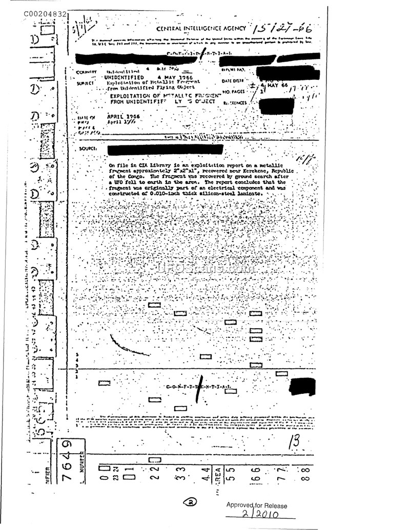 The CIA analyzed a metallic fragment recovered in the Congo after a 1965 UFO sighting. The laboratory concluded the object was a standard electrical generator armature component that had been subjected to extreme heat.