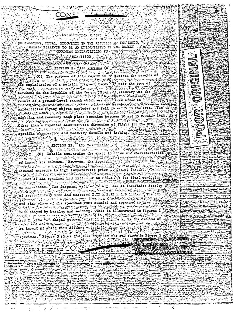 This exploitation report details the analysis of a metallic fragment recovered near the town of Kenge in the Republic of the Congo following an incident between October 10 and 15, 1963. The fragment, which was recovered after a ground-level search following the explosion of an unidentified flying object, was subjected to a technical examination to determine its origin and nature. The report notes that the object was observed flying in an east-to-west direction before it exploded. The physical specimen measured 2.25 by 1.75 by 1.0 inches and weighed 41 grams. Technical analysis revealed that the fragment was composed of six machined or formed T-shaped fins and contained silicon steel laminates stacked on a mild steel core. The investigators concluded that the fragment was originally part of an electrical component, specifically a motor, generator armature, or similar electrical regulating device. The fabrication process was identified as consistent with standard procedures for electric motor armatures, utilizing stamped laminates and copper-plating. Evidence of exposure to temperatures exceeding 2550° F was found on the surface, and the report suggests the object was traveling at high velocity when it impacted the earth. Despite the detailed metallurgical analysis, the report explicitly states that the materials, processes, and dimensions used in the construction of the fragment prevented the determination of its exact country of origin.