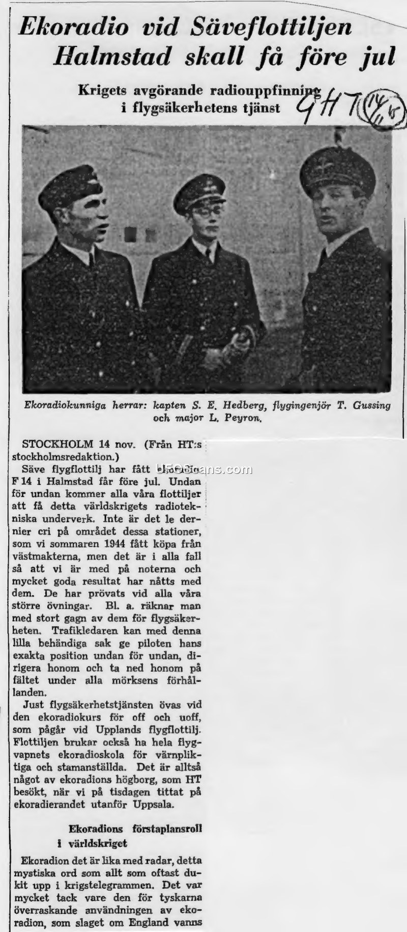 This newspaper article, dated November 14, 1944, reports on the integration of radar technology—referred to as 'ekoradio'—into the Swedish Air Force. The report highlights that the Säve Air Flotilla has received this equipment, with the F 14 unit in Halmstad scheduled to receive it before Christmas. The author notes that these systems were purchased from Western powers in the summer of 1944. The primary purpose of this technology is to enhance flight safety, enabling traffic controllers to track a pilot's exact position and guide them during landing in poor visibility conditions. The article also mentions that training for officers and non-commissioned officers is currently underway at the Upplands Air Flotilla, which serves as a hub for radar training for both conscripts and permanent staff. The text concludes by emphasizing the historical significance of radar in the ongoing World War, noting its decisive role in the Battle of Britain.