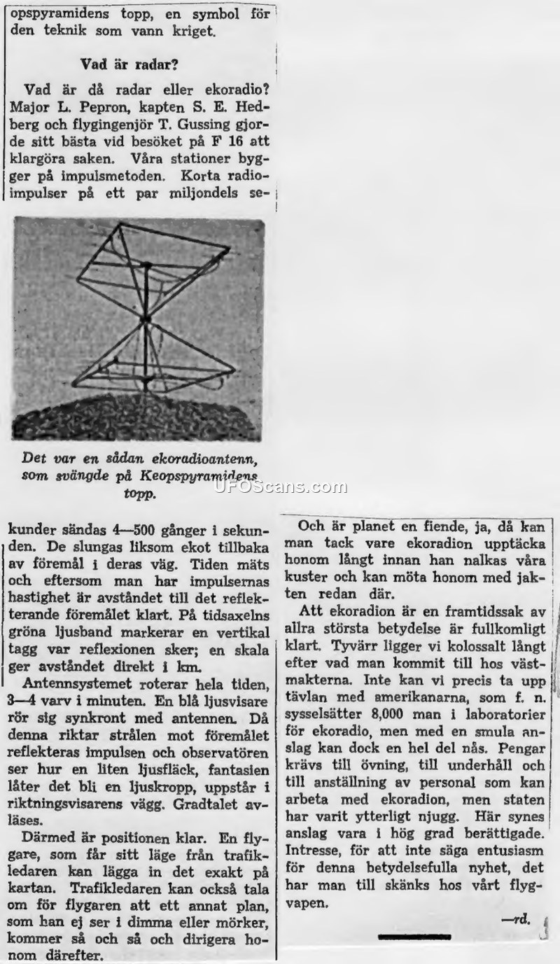 This document, authored by an individual identified as '-rd.', provides a technical overview of radar technology, referred to as 'ekoradio' in Swedish. The text begins by referencing a visit to F 16 by Major L. Pepron, Captain S. E. Hedberg, and Flight Engineer T. Gussing, who explained the pulse method used by their stations. The document details how short radio pulses are transmitted 400-500 times per second, reflecting off objects to determine distance based on the time taken for the echo to return. It describes the mechanical operation of the antenna, which rotates 3-4 times per minute, and how a blue light indicator moves in synchronization to allow an observer to identify the position of an object on a screen. The author emphasizes the strategic importance of radar for national defense, noting that it allows for the detection of enemy aircraft long before they reach the coast. The document concludes with a critique of the current state of Swedish radar development, stating that Sweden is significantly behind Western powers. The author highlights that while the United States employs 8,000 people in radar laboratories, Sweden has been 'extremely stingy' with funding. The author advocates for increased government investment in training, maintenance, and personnel, noting that the Swedish Air Force possesses the necessary interest and enthusiasm for this technology.
