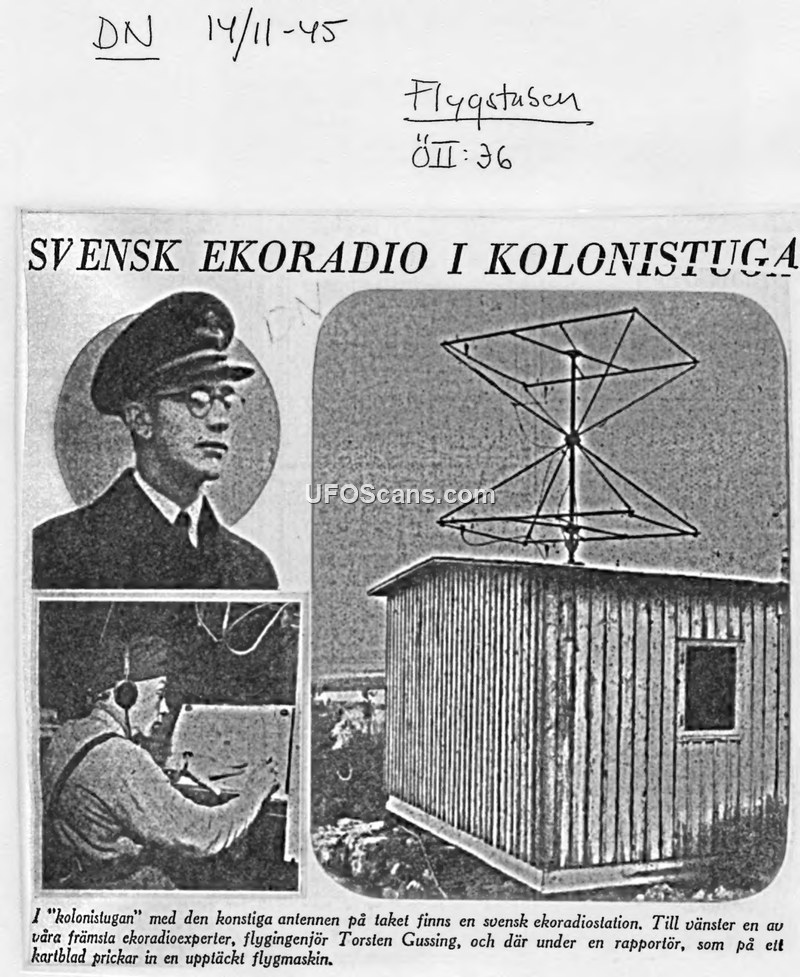 A 1945 press clipping documenting Swedish radar technology and the work of flight engineer Torsten Gussing in tracking aircraft.