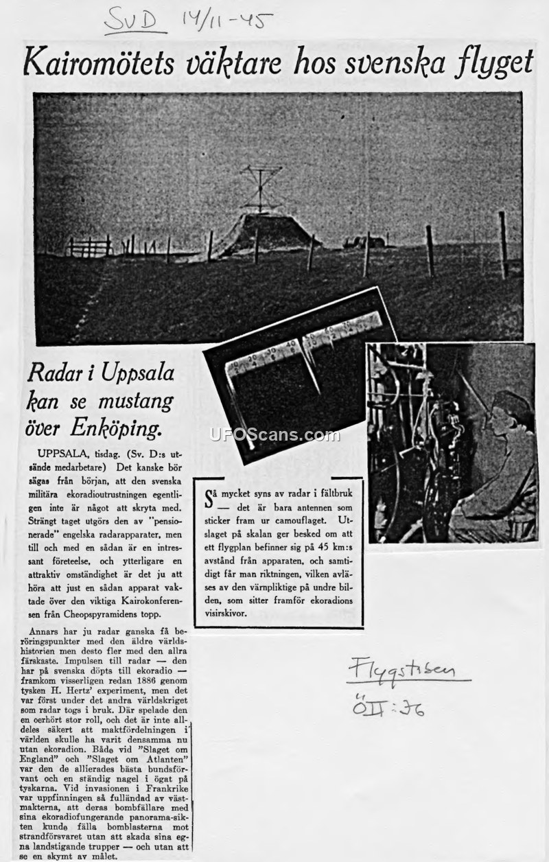 A 1945 newspaper report detailing the use of retired British radar equipment by the Swedish military. It highlights the historical significance of radar in WWII and provides a specific operational example of its range.