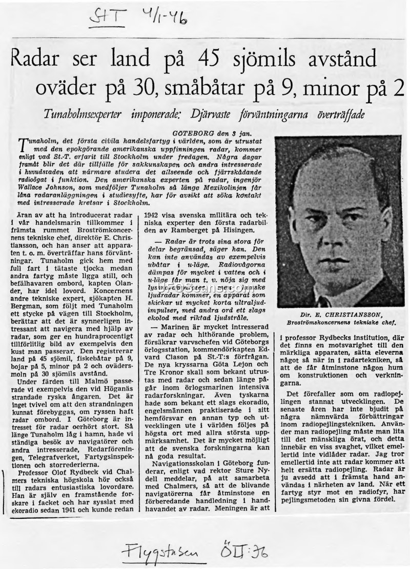 This newspaper article, dated January 3, 1946, reports on the arrival of the Swedish merchant vessel Tunaholm in Stockholm, which is equipped with advanced American radar technology. The article details the capabilities of this radar system, which allows the ship to navigate safely through dense fog by detecting land, small boats, buoys, mines, and storm clouds at varying distances. The technology is praised by the Broström Group's technical director, E. Christiansson, and the ship's captain, Öländer. The article further explores the broader interest in radar technology within Sweden, citing Professor Olof Rydbeck of Chalmers University of Technology, who has been researching echo-radio since 1941. Rydbeck notes that while radar is a significant advancement, it has limitations, particularly regarding underwater use by submarines, where sound-based systems might be more effective. The Swedish Navy is also reported to be heavily involved in radar research, with plans to equip new cruisers, Göta Lejon and Tre Kronor, with the technology. Finally, the Navigation School in Gothenburg is considering integrating radar training into its curriculum in collaboration with Chalmers.