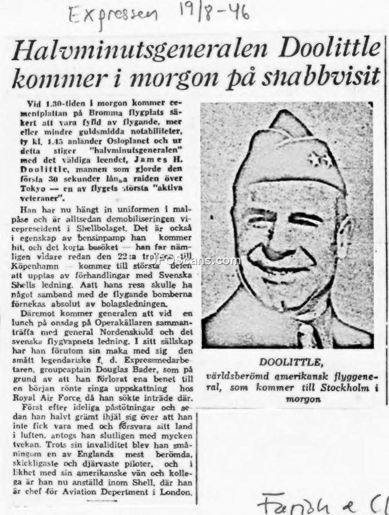 This newspaper article from the Swedish publication Expressen, dated August 19, 1946, reports on the upcoming visit of General James H. Doolittle to Stockholm. Doolittle, described as the 'half-minute general' famous for the Tokyo raid, is scheduled to arrive at Bromma Airport at 1:45 AM on the following Wednesday. The article notes that Doolittle is visiting in his capacity as a vice president of the Shell company to conduct negotiations with the Swedish Shell leadership. The company explicitly denies that his trip has any connection to 'flying bombs' (flygande bomberna). During his visit, Doolittle is expected to have lunch at the Operakällaren with General Nordenskiöld and the leadership of the Swedish Air Force. He is accompanied by his wife and Group Captain Douglas Bader, a legendary pilot who lost a leg and overcame initial resistance from the Royal Air Force to serve. Bader is also currently employed by Shell as the head of their Aviation Department in London.