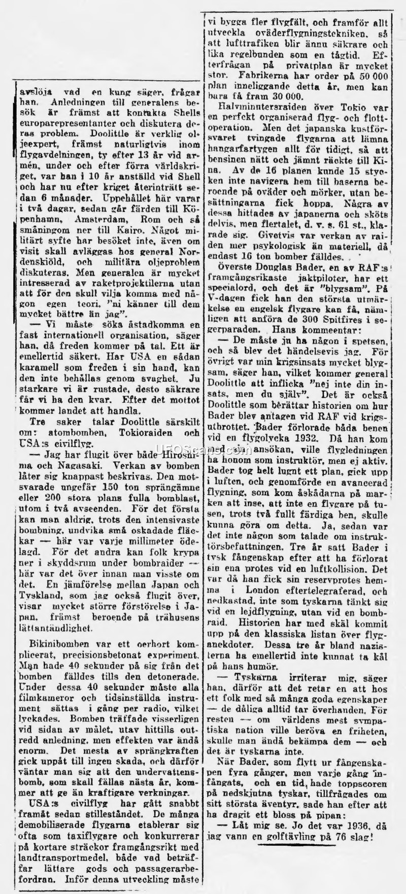 This document is a press report detailing an interview with General James Doolittle during his visit to Europe. Doolittle, an oil expert who served 13 years with Shell, discusses the post-war state of aviation, the necessity of a strong international organization, and the importance of military readiness for the United States. He provides personal observations on the atomic bombings of Hiroshima and Nagasaki, noting the immense destruction and comparing it to his experiences flying over Germany. He also discusses the 'Bikini bomb' experiment, describing it as a complex, precision-engineered test that utilized radio-controlled instrumentation. The article further covers the Tokyo raid, noting the logistical challenges faced by the pilots, and provides an anecdotal account of RAF Colonel Douglas Bader, a double-amputee pilot who continued to fly despite his injuries and spent time in German captivity. The text concludes with Bader's reflections on his wartime experiences and his perspective on the German people.