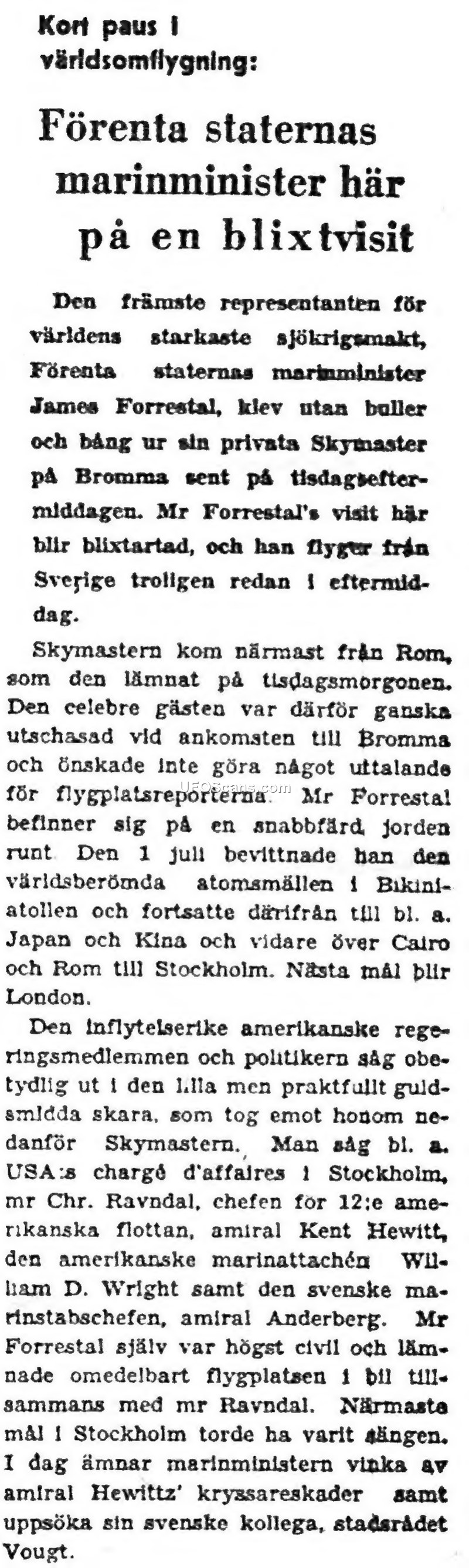 This newspaper article reports on the arrival of United States Secretary of the Navy James Forrestal at Bromma Airport in Stockholm, Sweden, on a Tuesday afternoon in July 1946. Forrestal arrived via his private Skymaster aircraft, having traveled from Rome. The article notes that he was on a rapid world tour, which included witnessing the atomic bomb test at Bikini Atoll on July 1, followed by visits to Japan, China, Cairo, and Rome. Upon his arrival in Stockholm, he was greeted by several officials, including the US Chargé d'affaires in Stockholm, Mr. Chr. Ravndal, Admiral Kent Hewitt of the 12th US Fleet, US Naval Attaché William D. Wright, and the Swedish Chief of Naval Staff, Admiral Anderberg. The article mentions that Forrestal intended to visit Admiral Hewitt's cruiser squadron and meet with his Swedish counterpart, Minister of Defense Vougt, before departing Sweden, likely the following afternoon, with London as his next destination.