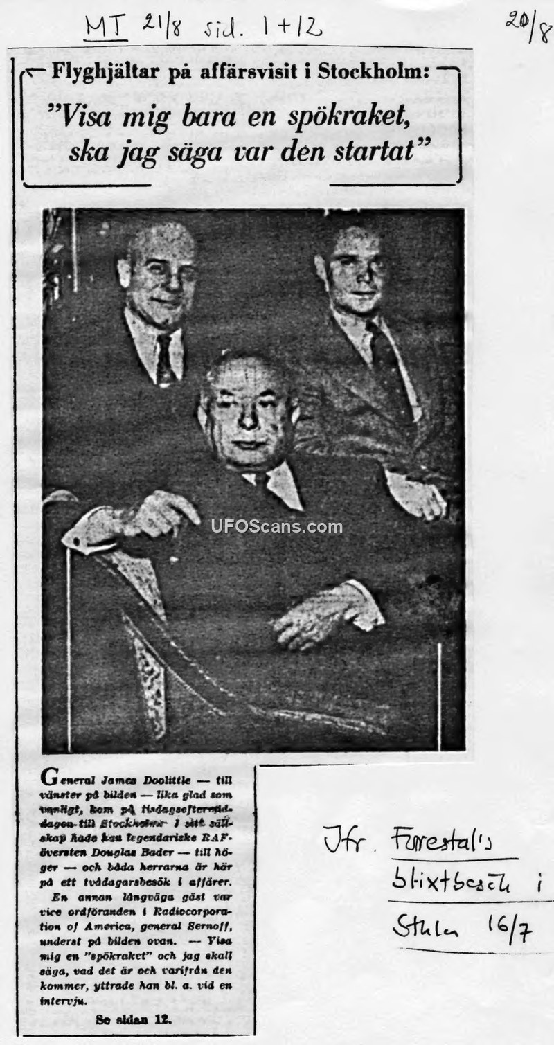 A newspaper clipping reporting on the visit of General James Doolittle, Colonel Douglas Bader, and General Sernoff to Stockholm, including a quote from Sernoff regarding 'ghost rockets'.