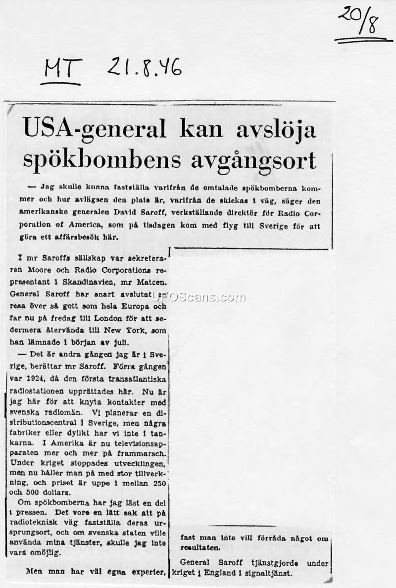 General David Saroff, an RCA executive, visited Sweden in August 1946 and publicly offered to use radiotechnical methods to identify the origin of the 'ghost bombs' reported in the press.