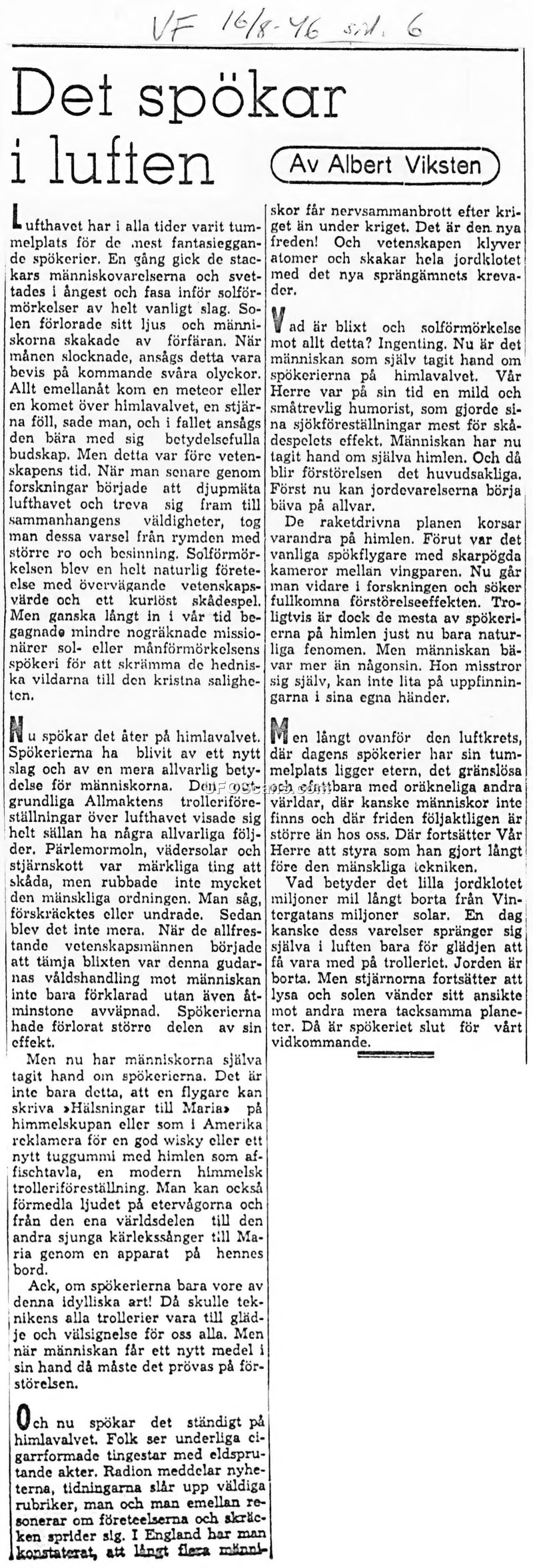 This article, written by Albert Viksten and published on August 16, 1946, explores the cultural and psychological impact of aerial phenomena in the post-World War II era. The author contrasts historical fears of natural events, such as solar eclipses or comets, with the contemporary anxiety surrounding 'ghost flyers' and strange, cigar-shaped objects with fire-spitting tails seen in the sky. Viksten argues that while humanity once looked to the heavens with religious awe, the advent of modern technology—specifically rocket-powered aircraft and atomic weaponry—has shifted the focus toward destruction. He notes that in England, there has been a marked increase in nervous breakdowns following the war. The author posits that while many of the current sightings are likely natural phenomena, the pervasive fear stems from humanity's distrust of its own technological capabilities and the potential for self-destruction. The piece concludes with a philosophical reflection on the insignificance of the Earth in the vastness of the universe, suggesting that the 'haunting' of the skies will only end when humanity ceases its own destructive tendencies.