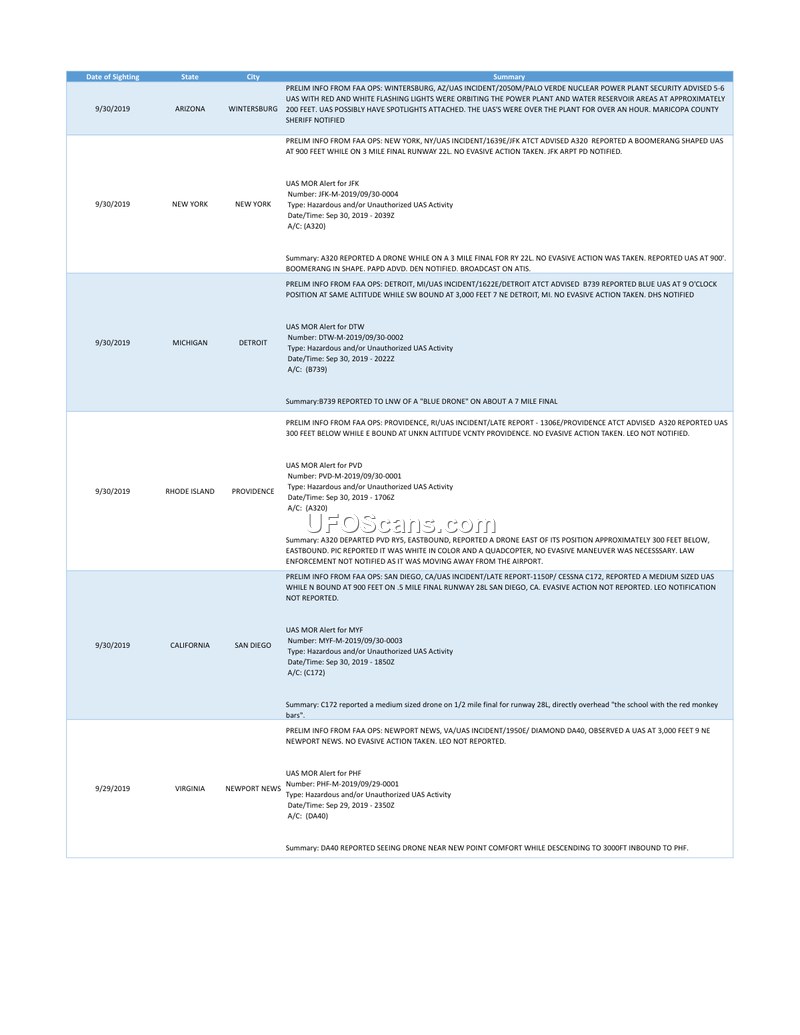 This document is a chronological log of hundreds of unauthorized drone sightings reported by pilots to the FAA between July and December 2019. It highlights the widespread nature of these incidents across the United States and the operational challenges they pose to aviation safety.