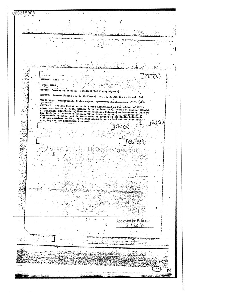 This document summarizes a 1968 Komsomol'skaya pravda article featuring interviews with Soviet scientists regarding UFOs. The experts discussed the phenomenon and emphasized the need for further scientific study.