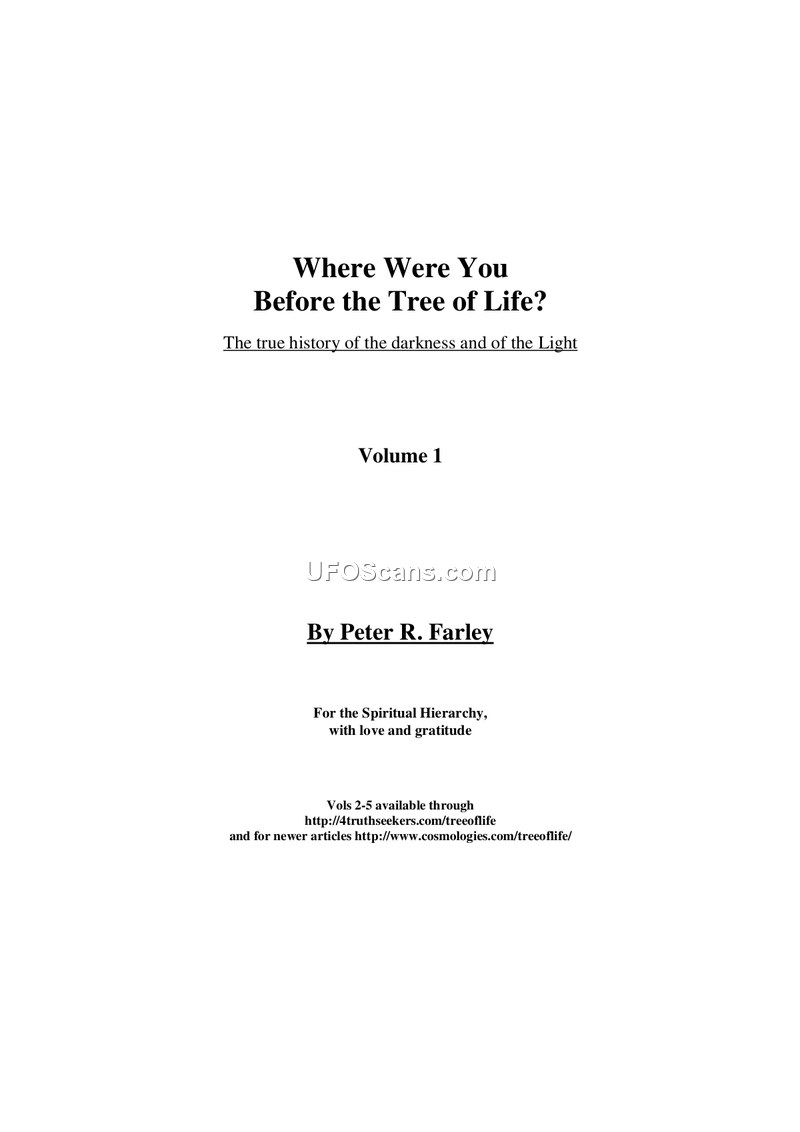 This document, Volume 1 of 'Where Were You Before the Tree of Life?' by Peter R. Farley, presents a metaphysical and historical narrative regarding the origins of the Universe, the nature of Creation, and the specific role of Earth within this cosmic framework. The author argues that the 'Tree of Life' is a universal archetype representing the quest for eternal life, which has been suppressed or censored from human history. The narrative details the creation of the Universe of Nebadon, governed by the Creator Son Enjliou and the Infinite Mother Spirit Callia. According to the text, an imbalance between these two Creator Parents led to the emergence of 'Lucifer' (the Father of Manifestation) and the subsequent fall of the Universe into duality and Darkness. The document asserts that Earth was originally intended as a private retreat for Enjliou and Callia but was later repurposed as an experiment in 3D physical density. This experiment, intended to allow souls to gain rapid spiritual growth by blending traits from various universal civilizations, has been compromised by the 'Luciferian' influence and the intervention of various extraterrestrial groups, including the Greys, the Orion Alliance, and the Draconian Federation. The author contends that Earth is currently a quarantined battleground, essential to the survival of the entire Universe. The text references various channeled sources, such as the 'Council of Nine' and 'Ramtha,' as well as interpretations of ancient myths, Gnostic scriptures, and the works of authors like Zecharia Sitchin and Edgar Cayce. It discusses the role of genetic manipulation, the 'starseeding' of humanity, and the cyclical nature of history, including the destruction of previous civilizations like Lemuria and Atlantis. The document emphasizes that humanity's current state of 'bondage' is a result of this history and that the path to liberation lies in recognizing one's true nature as a part of the 'One' and exercising free will in alignment with the Higher Will of the Father. The author concludes that the current era is a critical turning point, and that the 'Forces of Light' are engaged in a struggle against the 'Darkness' to save the souls of Earthlings.