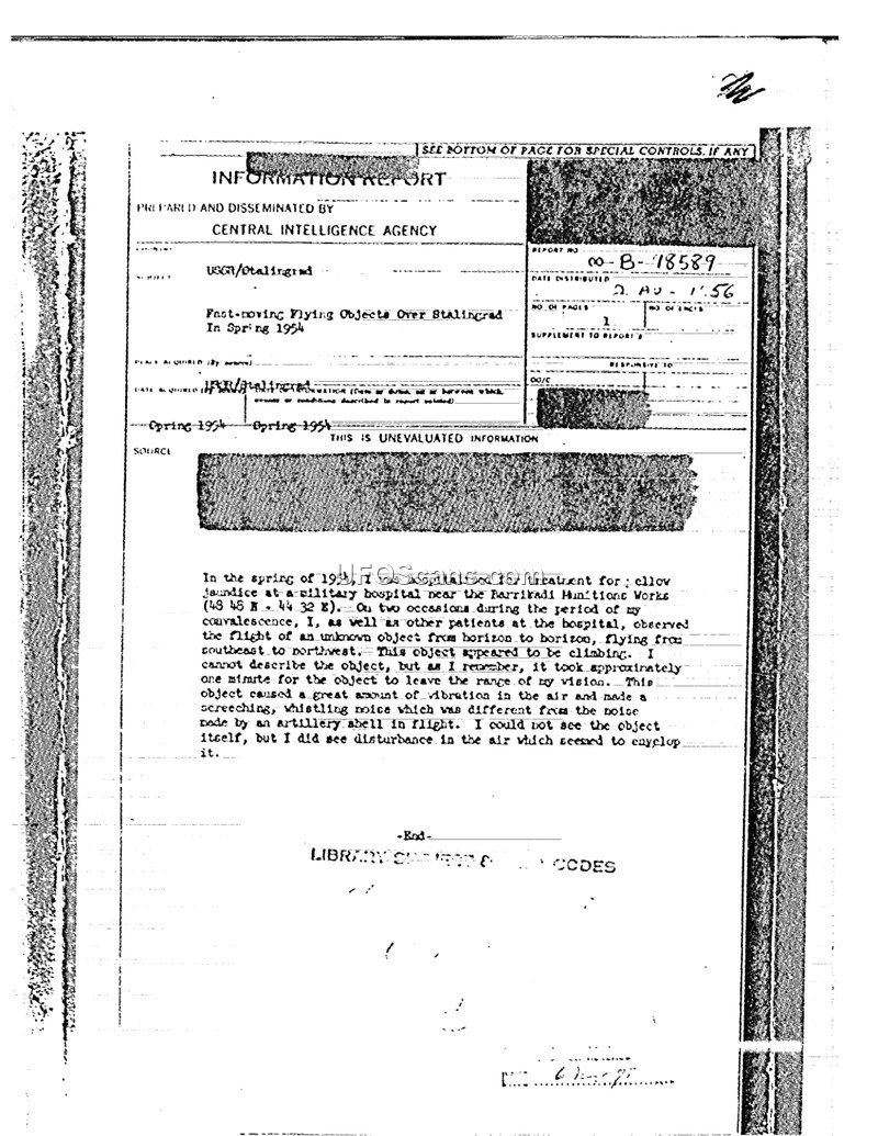 A CIA report detailing a 1954 sighting of an unidentified object near the Barrikadi Munitions Works in Stalingrad. The object was described as producing a unique screeching sound and air vibration while climbing.