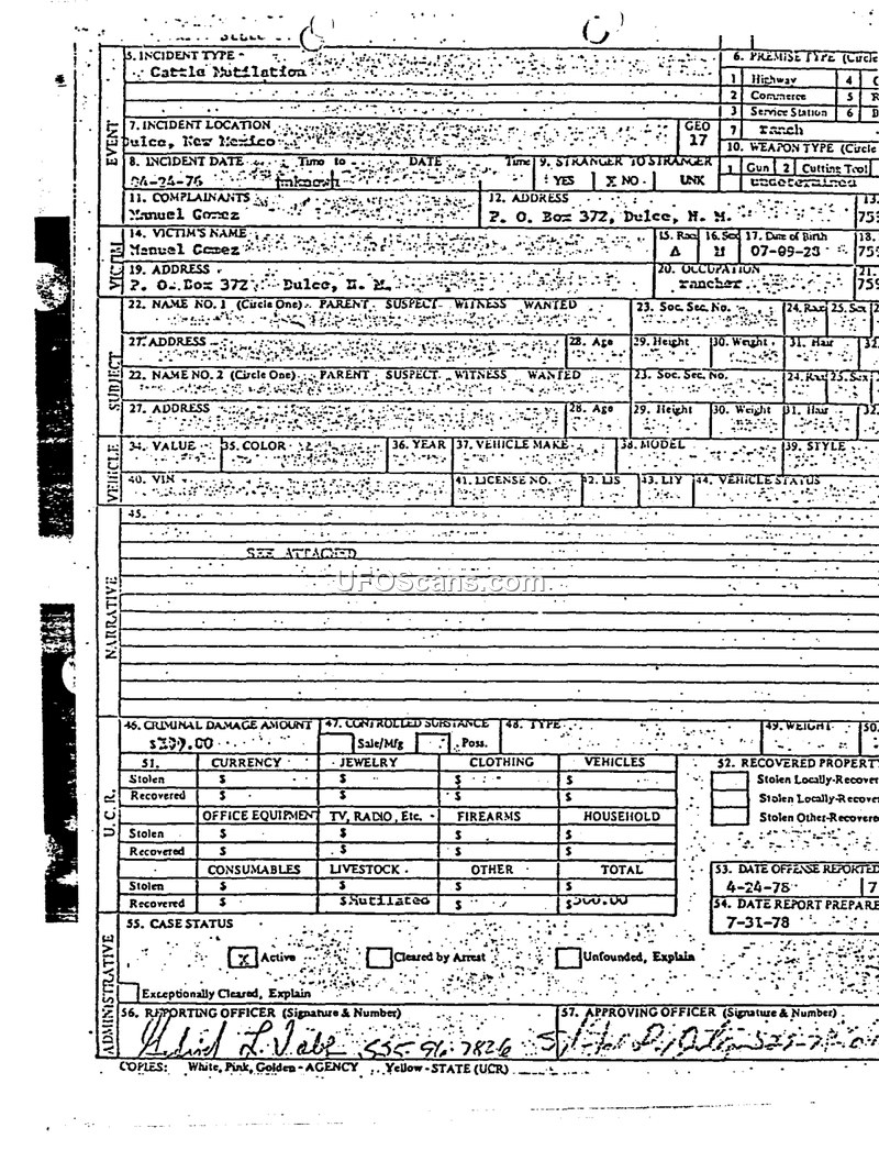 This collection of documents details the investigation into a series of cattle mutilations occurring in New Mexico and the broader Western United States between 1976 and 1979. The reports, primarily authored by Officer Gabriel L. Valdez of the New Mexico State Police, describe a recurring pattern of animal deaths characterized by the precise removal of organs, such as the tongue, lymph glands, and sexual organs, often performed with surgical accuracy. The carcasses were frequently found in a dehydrated state, sometimes with evidence of having been dropped from aircraft. Witnesses reported low-flying, unidentified aircraft in the vicinity of these incidents. Forensic analysis conducted by the Los Alamos Scientific Laboratory on tissue samples yielded inconclusive results, noting the presence of Clostridium species but failing to definitively identify the cause of death or the method of mutilation. The documents highlight the growing concern of local ranchers and political figures, including Senator Harrison Schmitt, who requested federal intervention. The FBI eventually became involved, specifically regarding mutilations occurring on Indian reservations, though the Bureau struggled with jurisdictional limitations and the lack of a clear federal offense. A conference held in Albuquerque in April 1979 brought together law enforcement officials, researchers, and witnesses to discuss the phenomenon. Various theories were presented, ranging from ritualistic cult activity and biological warfare experiments to extraterrestrial involvement. Despite the establishment of a code name, BOVMUT, and the allocation of grant money to the Santa Fe District Attorney's office to coordinate investigations, no definitive perpetrator or cause was identified. The reports emphasize the difficulty of the investigation due to the lack of eyewitnesses, the destruction of evidence, and the highly organized nature of the incidents.