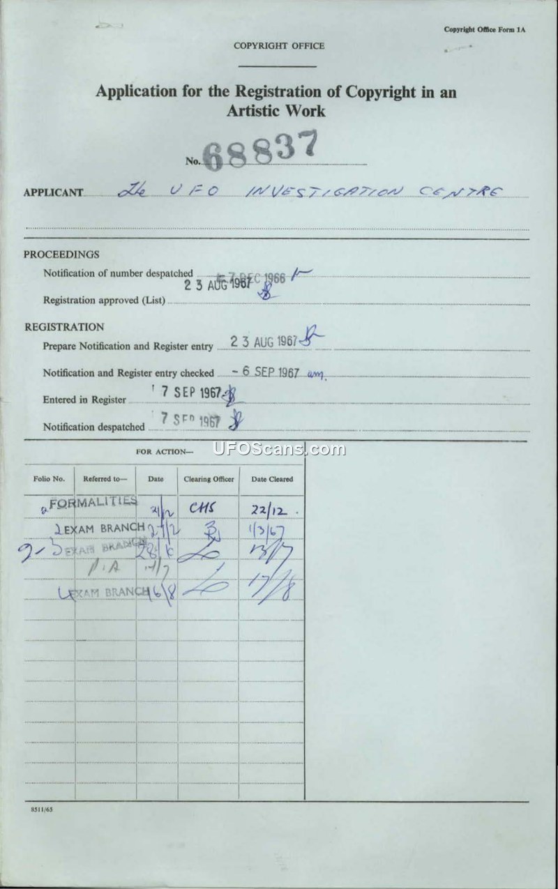 This document is a collection of administrative correspondence and forms related to the copyright registration of the 'Australian Flying Saucer Review' by the U.F.O. Investigation Centre in Australia. The file spans from 1966 to 1967 and documents the legal challenges faced by the Centre in securing copyright for their publication. The Patent Office initially rejected the application, noting that the Investigation Centre was not a legally constituted body capable of holding property in its own name. Consequently, the Centre had to resubmit applications under the name of Harry O'Brien, acting as a trustee. The correspondence includes various drafts of the application, examiner reports detailing deficiencies, and statements of address. Interspersed with these administrative records are several issues of the 'Australian Flying Saucer Review' itself. These issues contain articles on various UFO-related topics, including reports of sightings by X-15 pilots Robert White and Joseph Walker, the 'Mt. Shasta Mystery,' and the 'Ezekiel Saw Spaceship' theory. The publication also features editorials advocating for government transparency regarding UFO phenomena and lists various regional UFO research societies across Australia. The document provides a unique intersection between the bureaucratic process of copyrighting a niche publication and the content of the UFO research movement in Australia during the 1960s.