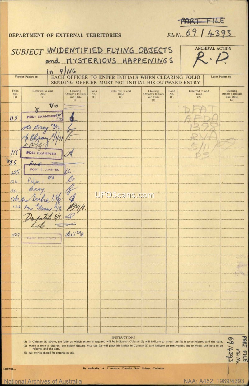 This document is a compilation file from the Department of External Territories regarding reports of Unidentified Flying Objects (UFOs) and mysterious happenings in the Territory of Papua and New Guinea between 1957 and 1973. The file contains various memoranda, telegrams, and reports documenting sightings by both European residents and local Papuan inhabitants. A significant portion of the file is dedicated to the well-publicized sightings reported by the Reverend Father William B. Gill at the Boianai Anglican Mission in 1959, which included claims of humanoid figures in a craft. Other reports detail sightings of falling objects, bright lights, and unexplained aerial phenomena across various districts, including the Milne Bay, Morobe, and Manus districts. The correspondence reflects the administrative handling of these reports, with the Department of External Territories frequently referring the information to the Department of Defence, the Department of Civil Aviation, and the Commonwealth Scientific and Industrial Research Organisation (CSIRO) for evaluation. The official stance, as reflected in the correspondence, often leaned toward identifying these phenomena as meteors, aircraft flares, or atmospheric effects, though the reports were treated with varying degrees of seriousness. By 1971, the Administrator of Papua and New Guinea agreed to the declassification of reports from non-official sources, noting that they did not contain classified material and should be regarded as public knowledge.