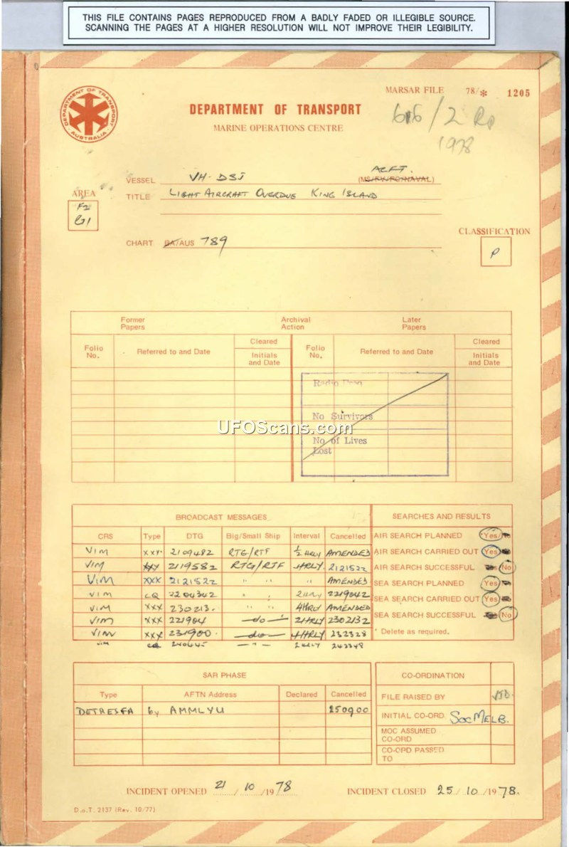 This file documents the 1978 search and rescue operation for pilot Frederick Valentich and his missing Cessna 182, which vanished after reporting a UFO. The search was unsuccessful, and the case remains a well-known mystery in Australian aviation history.