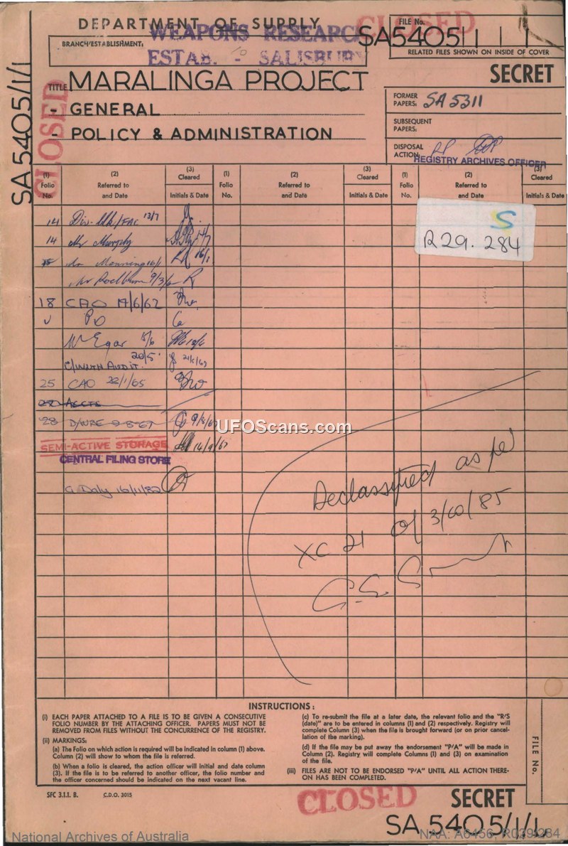 This file, titled 'Maralinga Project: General Policy & Administration', documents various administrative and operational matters related to the Maralinga Proving Ground in South Australia between 1956 and 1968. The file contains correspondence regarding the establishment of the site, financial arrangements between the Australian and United Kingdom governments, and routine administrative tasks such as the provision of trees for area beautification and the assignment of chaplains. A significant portion of the file concerns the investigation of an unidentified light observed in the Wewak area on 15 July 1960. Multiple witnesses, including constables and technical staff, reported seeing a white light travelling from East to West that turned red and was accompanied by two loud bangs. Security Officer J.J.A. Hanlon conducted an investigation, interviewing witnesses and consulting with scientific personnel. Various theories were proposed, including a meteor, static electricity ('St. Elmo's fire'), or a satellite component. Despite extensive inquiries, the source of the light could not be positively identified. The file also includes documentation regarding the downgrading of the file's security classification from Secret to Restricted in 1985.