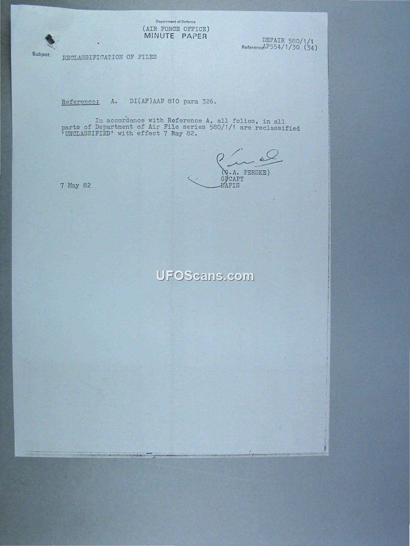 In accordance with Reference A, all folios, in all parts of Department of Air File series 580/1/1 are reclassified 'UNCLASSIFIED' with effect 7 May 82.