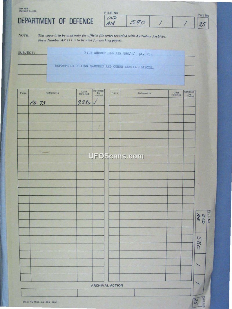 Department of Defence File OLD AIR 580/1/1 pt. 25: Reports on Flying Saucers and Other Aerial Objects