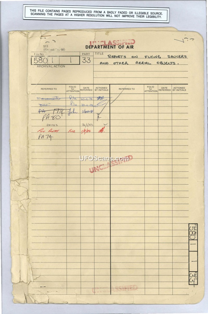Reports on Flying Saucers and Other Aerial Objects (File 580/1/1 Part 33)
