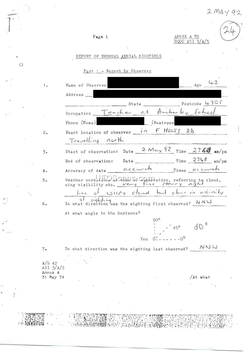 This document is a compilation of reports regarding unusual aerial sightings occurring primarily on 2 May 1992 in Queensland, Australia. The reports were collected and processed by W.O. Gillespie at RAAF Base Amberley. Multiple observers, including teachers, retail consultants, and truck drivers, reported seeing bright, often multi-colored lights in the night sky. Descriptions of the objects varied, with some witnesses describing circular, oval, or cigar-shaped objects, while others reported seeing balls of light in triangular or 'Z' formations. Many witnesses noted that the objects were brilliant, often iridescent green or orange, and that they were bright enough to illuminate the ground and surrounding areas, including motor vehicles. Several reports mentioned that the objects appeared to have trails or flames, and some witnesses described the objects as moving at high speeds or appearing to fall. Most observers reported that the sightings were silent, though one witness described a sound like the beginning of a police siren. The duration of the sightings was consistently short, typically lasting between 2 and 5 seconds. The document includes sketches provided by witnesses, as well as notes on the weather conditions, which were generally described as clear and starry. Some witnesses provided additional evidence, such as photographs or video tape of the end of the sighting. The reports indicate that the sightings were widespread across the region, with locations ranging from Amberley and Petrie to Beerwah and the area between Gatton and the Warrego Highway. The document serves as a record of these accounts, with some observers explicitly requesting feedback on the nature of the phenomena they witnessed.