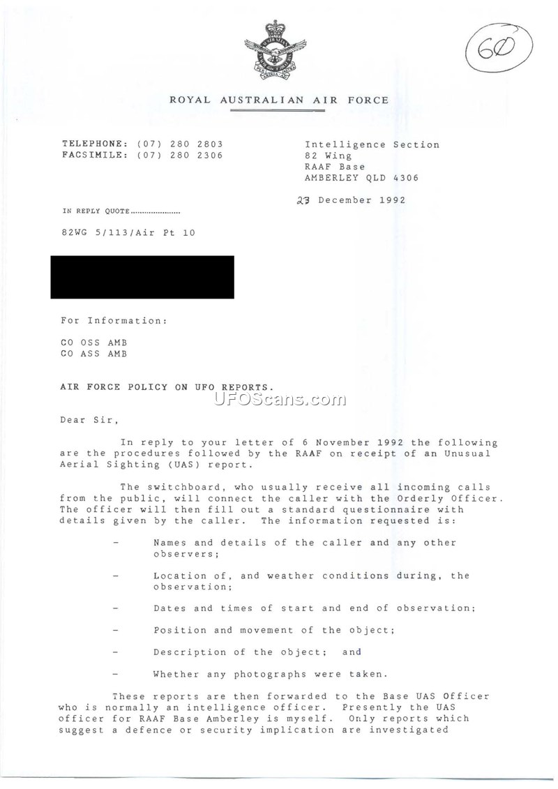 The RAAF procedure for UAS reports involves the switchboard connecting callers to the Orderly Officer, who completes a standard questionnaire. These are forwarded to the Base UAS Officer (usually an intelligence officer). Reports not considered a threat are referred to civilian UFO research organizations.