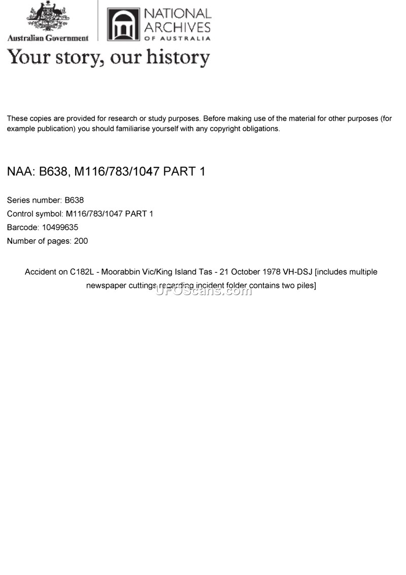 This file documents the 1978 disappearance of pilot Frederick Valentich and his Cessna 182L over Bass Strait after he reported an unidentified object. Despite an extensive search, no wreckage was found, and the official investigation concluded it was an aircraft accident, though the case remains a notable subject of UFO interest.