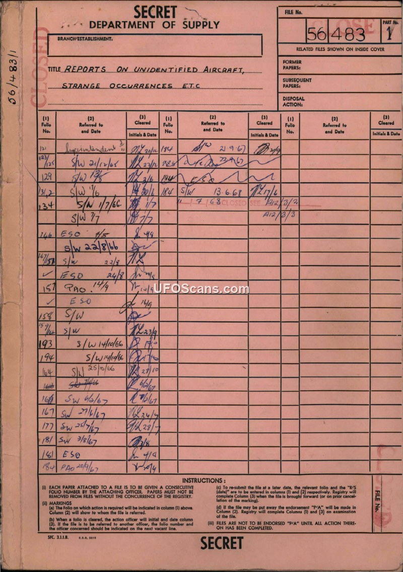 This file, titled 'Reports on Unidentified Aircraft, Strange Occurrences, etc.' (File No. 56/483), documents the administrative handling of public reports and internal sightings of unidentified aerial phenomena (UAP) and space vehicle fragments by the Australian Department of Supply's Weapons Research Establishment (WRE) at Woomera between 1952 and 1968. The archive consists of correspondence with the public, internal memoranda, and security reports. Many public reports of 'strange lights' or 'flying saucers' were investigated by WRE staff, who frequently identified the objects as known satellites (such as Echo 1 or Pegasus 1), meteors, or atmospheric phenomena like Venus. For instance, several letters from the public were answered by providing orbital data for satellites. Internal reports often focused on unidentified aircraft sightings near the Woomera range, which were investigated by the Establishment Security Officer and the R.A.A.F. to ensure range security. These investigations often involved checking with local pastoral properties and civil aviation authorities. In several cases, such as a sighting in 1966, the WRE concluded that the aircraft was likely a light aircraft involved in local air shows or civilian traffic, though some remained unidentified. The file also documents the recovery of metal fragments, which were sometimes suspected to be space debris. The tone of the correspondence is professional and informative, with the WRE acting as a point of contact for public curiosity regarding space-related events. The file reflects a period of high public interest in space exploration and UFOs, with the WRE maintaining a policy of providing factual, scientific explanations where possible while ensuring the security of the Woomera range.