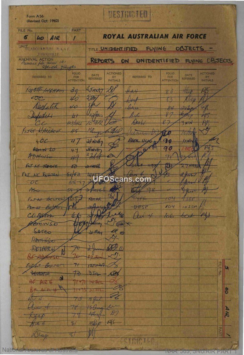 This document file from the National Archives of Australia (NAA: J63, 5/40/AIR PART 1) comprises a collection of correspondence, intelligence reports, and administrative records regarding Unidentified Aerial Phenomena (UAP) sightings in Queensland, Australia, spanning from 1966 to 1970. The records are primarily generated by the Royal Australian Air Force (RAAF) Base in Townsville. The file documents the standard operating procedure for investigating these reports, which involved coordinating with the Department of Civil Aviation, local police stations, and meteorological bureaus to verify potential explanations such as aircraft movements, weather balloons, or astronomical events. Notable reports include a sighting at Atherton on September 9, 1970, where radar scans at Saddle Mountain were conducted, and various sightings in the Mackay and Tully areas. The correspondence reflects the RAAF's methodical approach to these reports, often providing witnesses with explanations such as the planet Venus or jet aircraft when evidence supported such conclusions. The file also includes administrative guidance from Headquarters Operational Command regarding the importance of thorough reporting and the use of standardized pro-forma questionnaires to ensure consistent data collection for scientific assessment. The documents demonstrate a clear effort by the RAAF to maintain public order and provide rational explanations for aerial sightings while fulfilling their security mandate.