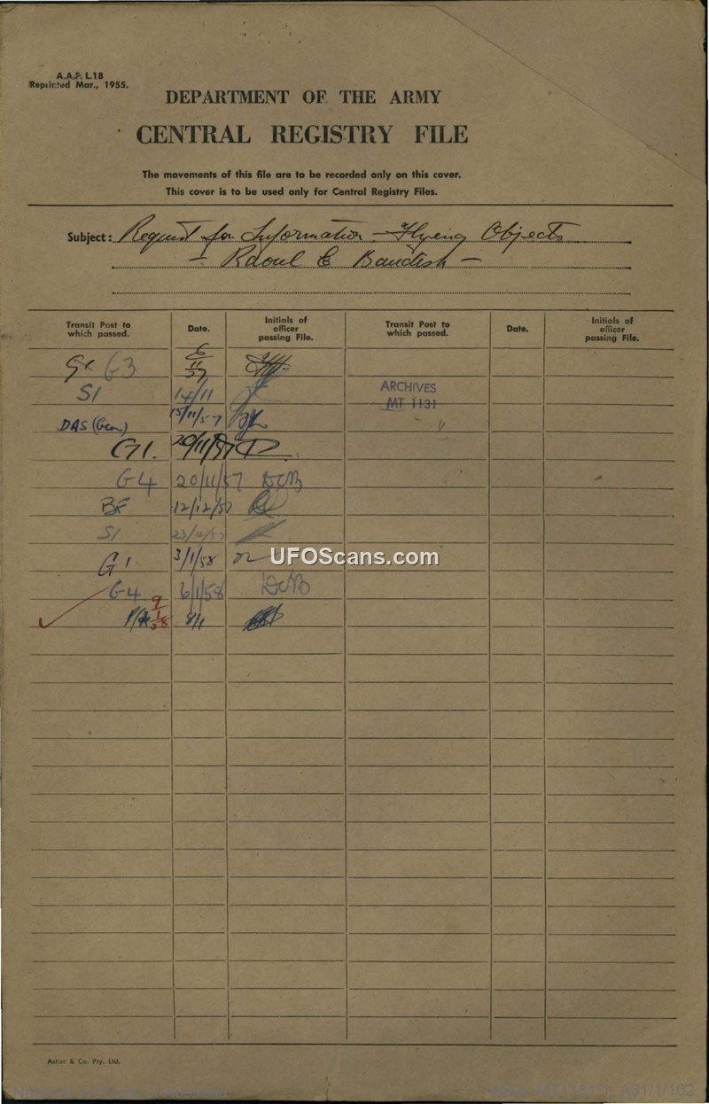This file documents a 1957 inquiry by Raoul E. Baudish, an influential resident in the Minister for the Army's electorate, regarding sightings of unidentified flying objects (UFOs) in Australia, specifically in relation to military exercises. Mr. Baudish wrote to the Minister for the Army, J.O. Cramer, on October 28, 1957, expressing concern that such objects had been observed during military exercises and that the government had a responsibility to release information. The Minister's office initiated an inter-departmental investigation, consulting the Department of the Navy and the Department of Air. The Department of Air reported that they had received 11 official reports in the preceding twelve months. Their investigation concluded that two were meteorological balloons, five were likely aircraft, and the remainder lacked sufficient evidence to determine their nature, though they noted that investigations in the United States suggested such reports did not relate to anything abnormal. The Department of the Navy reported that their last received report was in 1954, though they noted a specific incident involving a naval pilot at R.A.N. Air Station, Nowra, who observed lights and vague shapes on radar during a night flight. Both departments confirmed that no sightings were linked to military exercise areas. The file concludes with internal administrative notes directing staff to hold the file until all replies were received and then to 'kill the matter,' indicating a desire to close the inquiry once the ministerial response was finalized.