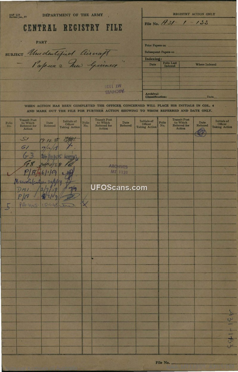 Investigations by the Department of Civil Aviation and the Department of Territories failed to identify the objects reported in Papua and New Guinea in late 1958 and mid-1959.