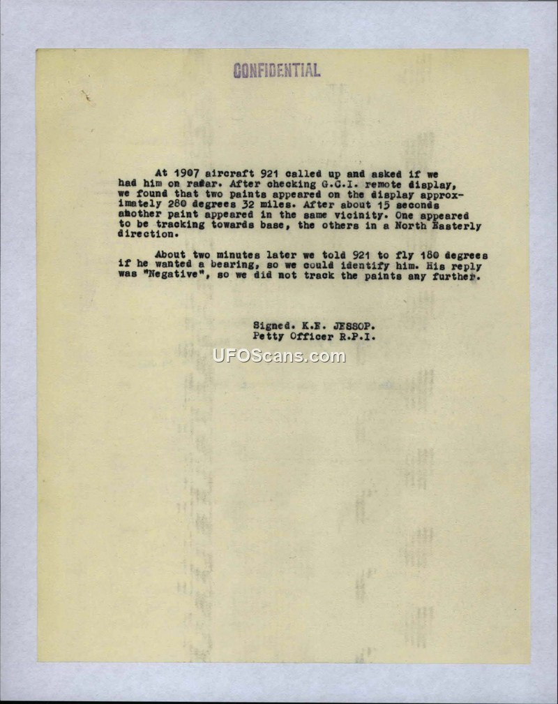 It has been ascertained that there were no R.A.A.F. aircraft in the vicinity at the time but that a Convair belonging to T.A.A. was in that area at 14000 ft. on a Northerly course.