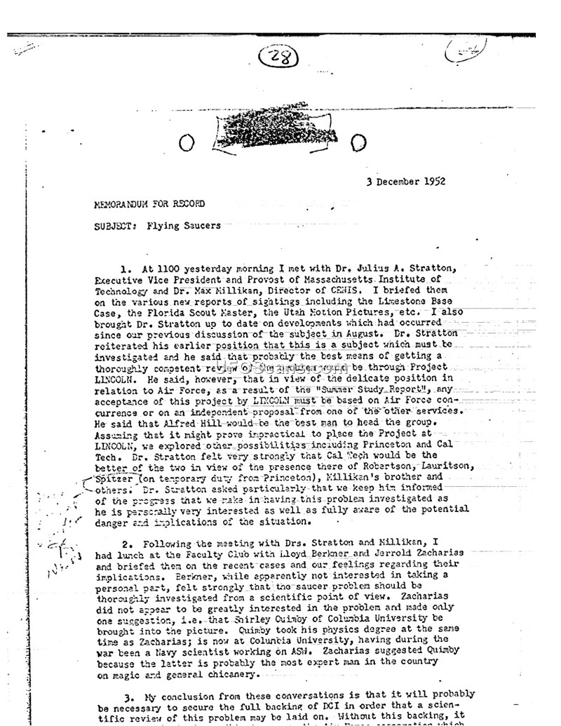 This memorandum, dated 3 December 1952, documents a series of meetings held by the author, P. G. Strong of the OSI, regarding the subject of 'Flying Saucers.' On the previous day, Strong met with Dr. Julius A. Stratton (Provost of MIT) and Dr. Max Millikan (Director of CENIS) to brief them on recent sighting reports, including the Limestone Base Case, the Florida Scout Master, and the Utah Notion Pictures. Dr. Stratton expressed that the subject required investigation and suggested that Project LINCOLN would be the most competent vehicle for such a review, provided it had Air Force concurrence. Stratton recommended Alfred Hill to lead the group, though he also considered Princeton and Cal Tech as alternatives, ultimately favoring Cal Tech due to the presence of experts like Robertson, Lauritson, and Spitzer. Following this, Strong met with Iloyd Berkner and Jerrold Zacharias to discuss the matter. While Berkner was not interested in personal involvement, he agreed on the need for scientific investigation. Zacharias suggested that Shirley Quimby of Columbia University be involved, noting his expertise in 'magic and general chicanery.' The memorandum concludes with Strong's assessment that the support of the DCI is essential to facilitate a scientific review and to secure necessary Air Force cooperation regarding reports and data.