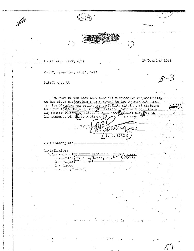 In view of the fact that over-all substantive responsibility on the above subject has been assigned to the Physics and Electronics Division and action responsibility within that division assigned to the Colonel, Operations Staff must coordinate any matter concerning FLYING OBJECTS with Colonel Cier[illegible]