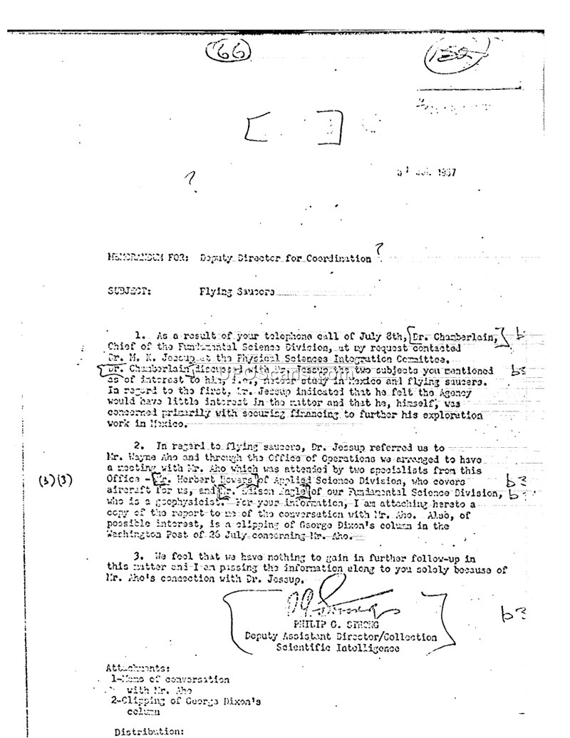 This memorandum, dated July 30, 1957, from the Office of Scientific Intelligence to the Deputy Director for Coordination, addresses the agency's assessment of inquiries regarding flying saucers. Following a telephone call on July 8th, Dr. Chamberlain of the Fundamental Science Division contacted Dr. M. K. Jessup of the Physical Sciences Integration Committee. The agency's assessment was that Dr. Jessup's primary interest lay in securing financial support for his exploration work in Mexico, rather than providing substantive intelligence on flying saucers. Dr. Jessup had referred the agency to Mr. Wayne Aho. Consequently, the Office of Operations arranged a meeting with Mr. Aho, which was attended by specialists from the Applied Science Division and the Fundamental Science Division. Following this meeting and a review of a George Dixon column from the Washington Post, the author, Philip G. Strong, concluded that there was no value in further pursuing the matter or maintaining contact with Mr. Aho regarding his connection to Dr. Jessup.