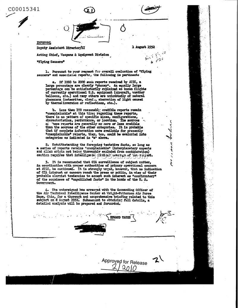 A 1952 CIA memorandum assessing 'flying saucer' reports, noting that most are explained by known phenomena while recommending continued, discreet surveillance of the remaining 'unexplainable' cases.