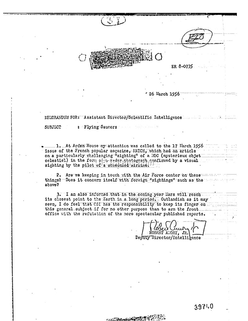 This memorandum, dated 26 March 1956, was authored by Robert Amory, Jr., the Deputy Director of Intelligence, and addressed to the Assistant Director of Scientific Intelligence. The document concerns the subject of 'Flying Saucers.' Amory references an article from the 17 March 1956 issue of the French magazine 'MATCH,' which detailed a sighting of a 'mysterieux objet celeste' (mysterious celestial object). This sighting was reportedly documented via a radar photograph and confirmed by the visual observation of a pilot from a scheduled airline. Amory poses two questions to the recipient: whether the agency is maintaining contact with the Air Force regarding these phenomena, and whether the agency should concern itself with foreign sightings of this nature. Furthermore, Amory notes that Mars will reach its closest point to Earth in the coming year. He argues that because of this, the agency has a responsibility to monitor the subject, if only to provide the front office with the necessary information to refute more 'spectacular' published reports.