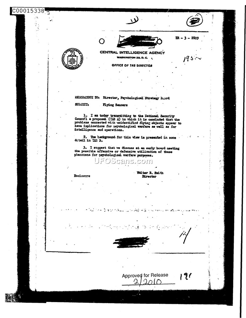 This memorandum, issued by the Director of the Central Intelligence Agency, Walter B. Smith, to the Director of the Psychological Strategy Board, addresses the intelligence and operational implications of unidentified flying objects (UFOs). The document asserts that the phenomenon is a matter of national security, particularly regarding the need for the U.S. military to distinguish between unidentified objects and potential enemy aircraft or missiles. The CIA expresses concern that the current Air Force inquiry, managed by the Air Technical Intelligence Center (ATIC) under Captain E. J. Ruppelt, is under-resourced and relies on a limited case-history approach that fails to provide a comprehensive understanding of the phenomena. The document highlights that the Air Force has not yet found significant cause for alarm, but the CIA argues that the lack of systematic research and the absence of cross-comparisons between sightings hinder the ability to determine if these objects are predictable or susceptible to control. The memorandum proposes that the National Security Council establish a centrally administered research program to define specific objectives, improve identification capabilities, and assess potential Soviet interest or psychological warfare applications. It also notes that the Soviet press has remained silent on the subject, which the CIA finds provocative. The document includes detailed appendices regarding the identification of weather balloons, which were frequently misidentified as UFOs, and outlines the need for better coordination between the Air Force, Navy, and intelligence components to resolve the problem of unidentified aerial phenomena.
