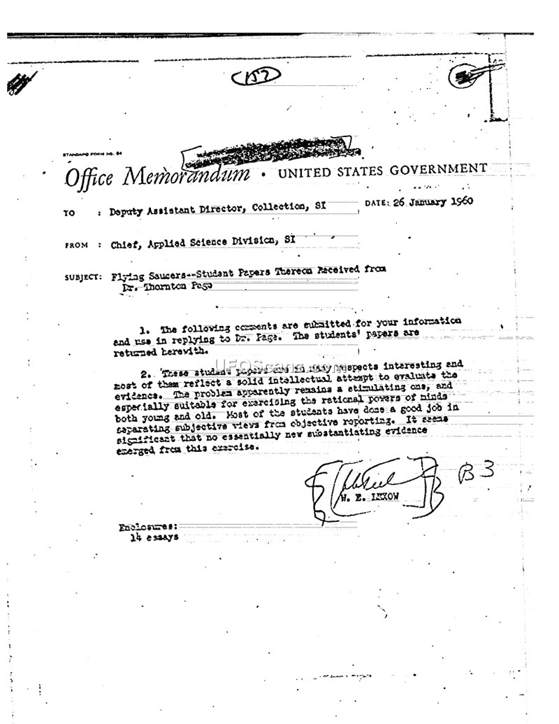 This office memorandum, dated 26 January 1960, from the Chief of the Applied Science Division, SI, to the Deputy Assistant Director, Collection, SI, concerns the return of 14 student essays regarding 'flying saucers' that had been provided by Dr. Thornton Page. The author notes that the papers represent a solid intellectual effort by the students to evaluate evidence and exercise rational thought. The author concludes that the students performed well in distinguishing between subjective views and objective reporting, though the exercise did not yield any significant new substantiating evidence regarding the subject.