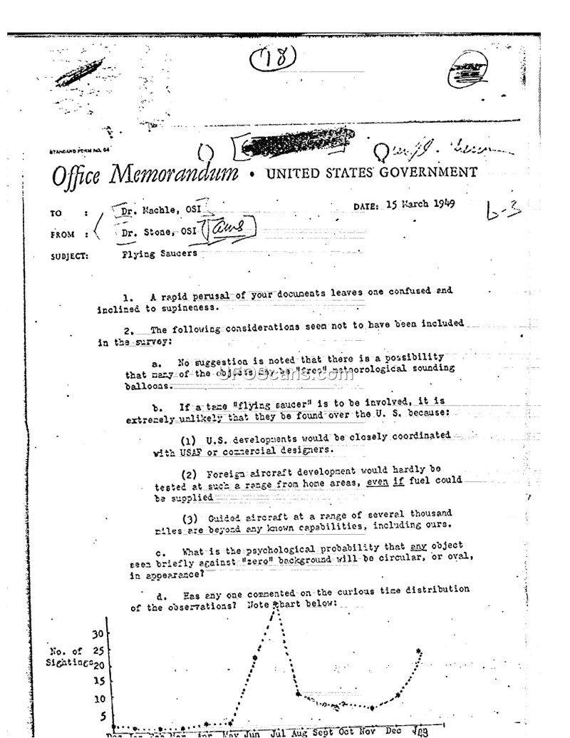 This memorandum, dated March 15, 1949, is addressed from Dr. Stone of the OSI to Dr. Machle, also of the OSI. The author provides a critical review of a previous survey regarding 'Flying Saucers.' Dr. Stone expresses dissatisfaction with the existing survey, stating that a rapid perusal of the documents leaves him 'confused and inclined to supineness.' He proceeds to outline several considerations that he believes were omitted from the survey. First, he suggests that many of the reported objects could potentially be 'free' meteorological sounding balloons. Second, he argues that it is highly unlikely that a 'flying saucer' would be found over the United States, citing three reasons: U.S. developments would be coordinated with the USAF; foreign aircraft would not be tested at such a range from their home areas; and guided aircraft with a range of several thousand miles are beyond any known capabilities, including those of the United States. Third, he questions the psychological probability of observers reporting objects as circular or oval in appearance when seen briefly against a 'zero' background. Finally, the author points to a chart illustrating the time distribution of sightings, which shows a significant peak in the summer months, and asks if there is any 'midsummer madness' involved or if asteroids are prominent during that season.