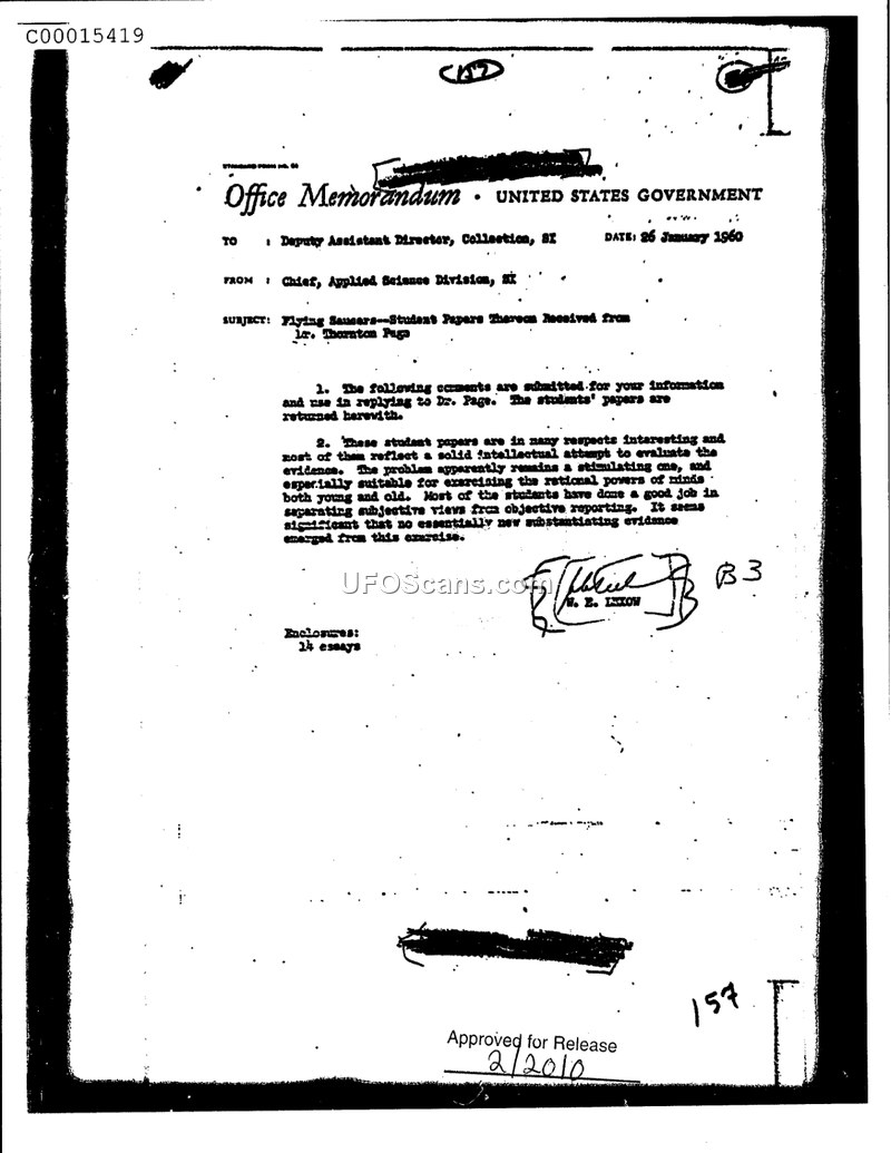This office memorandum, dated January 26, 1960, was authored by H. E. Likow, Chief of the Applied Science Division, and addressed to the Deputy Assistant Director of Collection. The document serves as a transmittal note for 14 student essays concerning 'flying saucers' that were being returned to Dr. Thornton Page. In his assessment of the papers, Likow notes that the students made a solid intellectual effort to evaluate the evidence. He observes that the subject remains a stimulating topic for exercising the rational powers of both young and old minds. Furthermore, Likow commends the students for their ability to distinguish between subjective views and objective reporting. Ultimately, he concludes that the exercise yielded no new, significant, or substantiating evidence regarding the phenomenon.