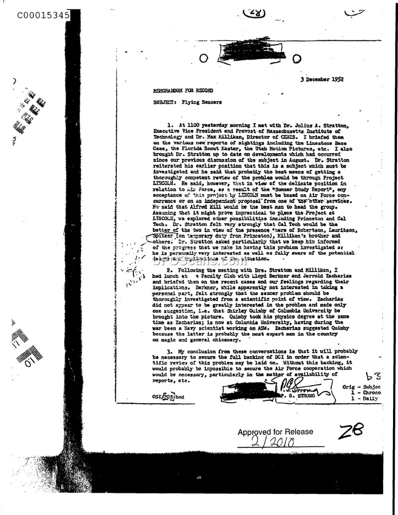 This memorandum, dated December 3, 1952, and authored by P. G. Strong of the OSI, details discussions regarding the scientific investigation of 'Flying Saucers.' The author recounts meetings held on December 2, 1952, with Dr. Julius A. Stratton and Dr. Max Millikan, during which they discussed various sighting reports, including the Limestone Base Case and the Florida Scout Master incident. The document notes that Dr. Stratton advocated for a thorough scientific review of the subject, suggesting that Project LINCOLN would be an appropriate vehicle for this, provided it had Air Force support. The author also mentions a lunch meeting with Lloyd Berkner and Jerrold Zacharias to discuss recent cases. While Berkner showed little personal interest in participating, Zacharias suggested that Shirley Quimby of Columbia University be consulted, describing him as a leading expert. The memorandum concludes that a formal scientific review is unlikely to succeed without full backing from the Department of Defense, particularly to ensure access to necessary reports.