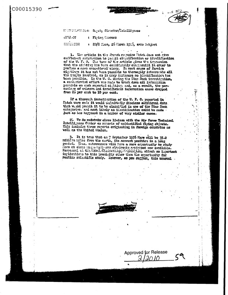 This memorandum, authored by Herbert Scoville, Jr., Assistant Director of Scientific Intelligence, addresses a report in a French magazine regarding Unidentified Flying Objects (U.F.O.s). The author critiques the article for failing to provide sufficient information to allow for proper identification of the phenomena. Scoville references the U.S. Air Force's Project Blue Book, noting that concentrated investigative efforts have successfully reduced the percentage of 'unknown' reports from 25 percent to 10 percent. He suggests that if the specific U.F.O. reported in the French publication were thoroughly investigated, it would likely be classified within existing Blue Book categories. The memorandum also highlights that the office maintains liaison with the Air Force Technical Intelligence Center regarding reports from both foreign countries and the United States. Furthermore, the document anticipates a potential surge in public reports of 'flying objects' and 'little green men' due to the upcoming proximity of Mars to Earth on 7 September 1955. While acknowledging that astronomers will have a rare opportunity for scientific study, the author notes that the Naval Observatory does not attach any important implications to this event. The memorandum concludes by stating that the office will continue to monitor the subject and provide updates on significant published reports.